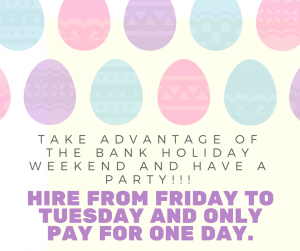 With the Easter Bank Holiday fast approaching we are offering a long weekend rental from Friday 30th March till Tuesday 3rd April  for just the one days hire, this is for warehouse collection items only, just book online and put in for one days hire and we will take care of the rest.