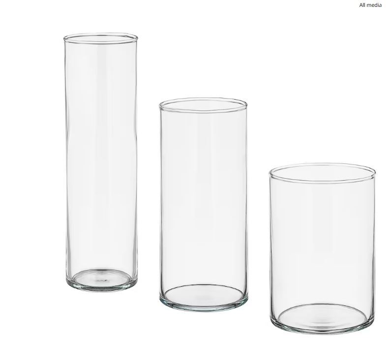 Comprises: 1 vase (height 28 cm, dia. 8 cm), 1 vase (height 23 cm, dia. 10 cm) and 1 vase (height 17 cm, dia. 12 cm).